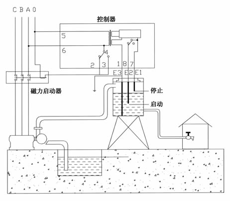 當液位下降到脫離E2時,因失去自鎖信號,控制線路就會回到原來狀態,②、④接點由常開又轉為常閉,水泵重新工始啟動向液罐注入液體。