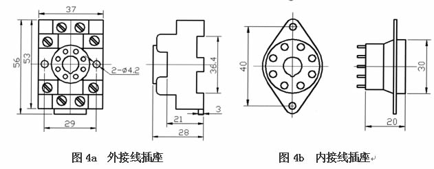 配線插座分內部連線和外部連線兩種,用戶可根據安裝形式選擇其中一種,它的外形尺寸(如圖4)