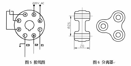 控制器的八腳插頭⑤、⑥ 接220VAC電源上,⑦、⑧、①插腳分別接傳感器電極E1、E2、E3、②、③、④插腳在直繼電器一 組輸出觸點上。